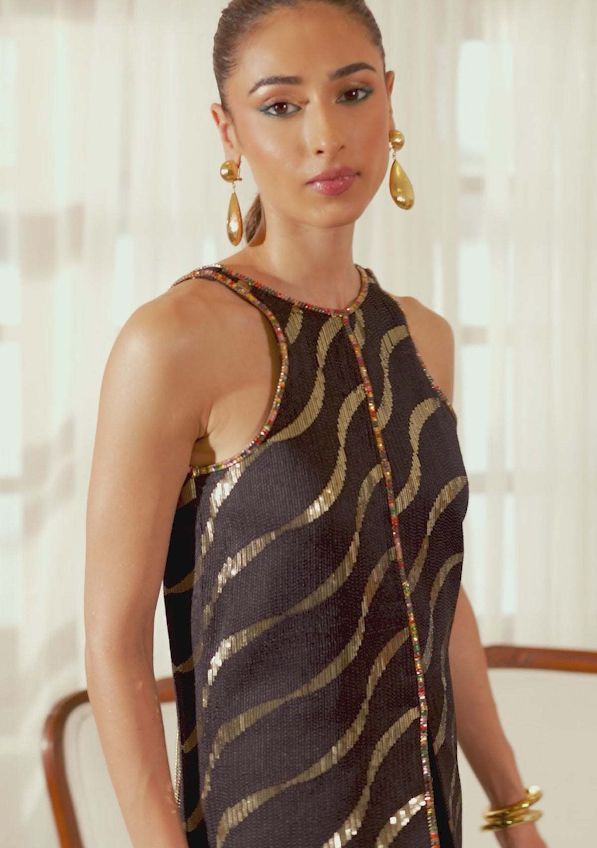 Aaria, the 70s inspired black set comes with a chiffon matching set with multicolored crystal edgings and a wide leg pair of palazzo pants.