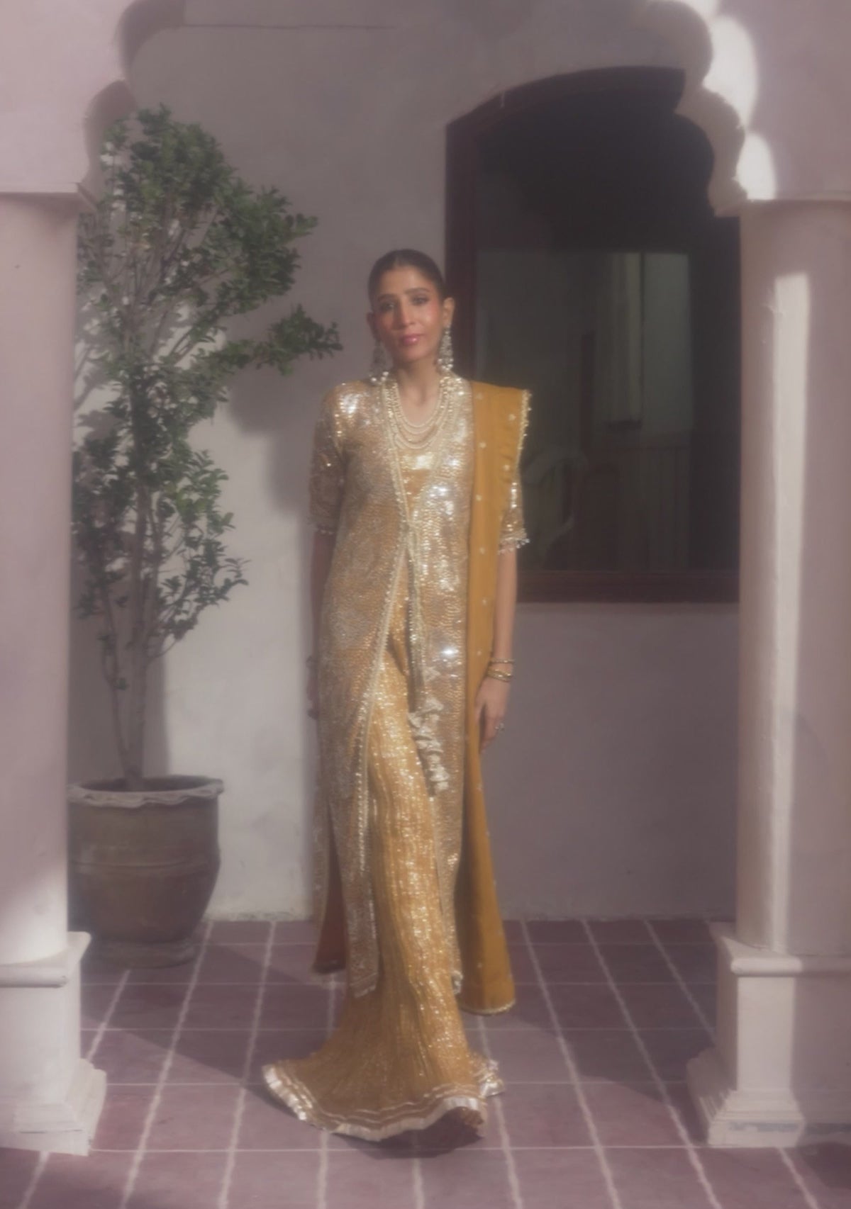 Abru, the mustard front open style shirt is embellished with gold and silver sequins in chiffon and it is paired with our glimmery crushed chiffon sharara. The set is paired with a silk boti dupatta with lime and black finishings.