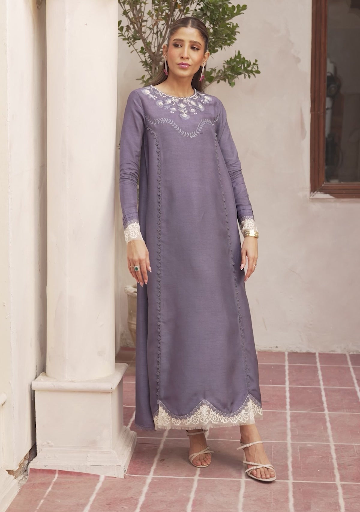 Arya, the purple a line shirt comes with intricate embroidery and kora dabka work on the neckline along with contrasting embroidered borders on the sleeves and hem. The pure bamber raw silk shirt is paired with matching izaar and a pure organza screenprint dupatta.