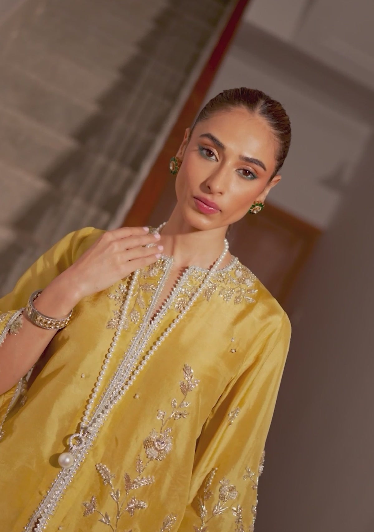 Asna, the tassel silk cropped kurta comes with asymmetrical handwork details and is paired with a coordinating shalwar with gold and silver detailing.