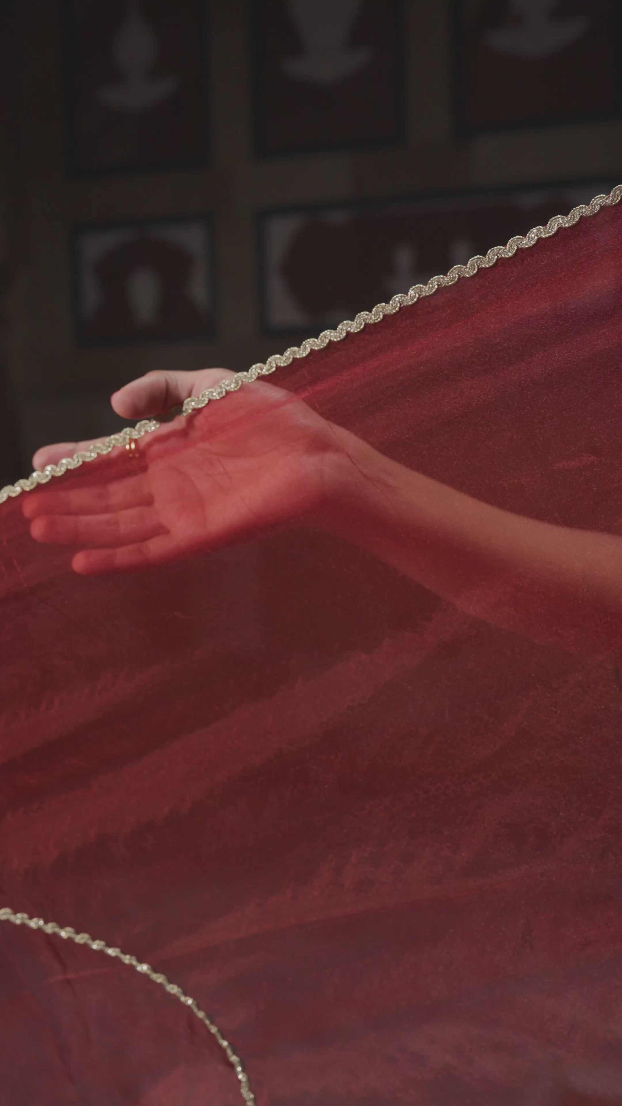 Ayda, the rust velvet front open shirt comes with asymmetrical gold hand embellishments paired with an embellished hemmed izaar and an organza dupatta.