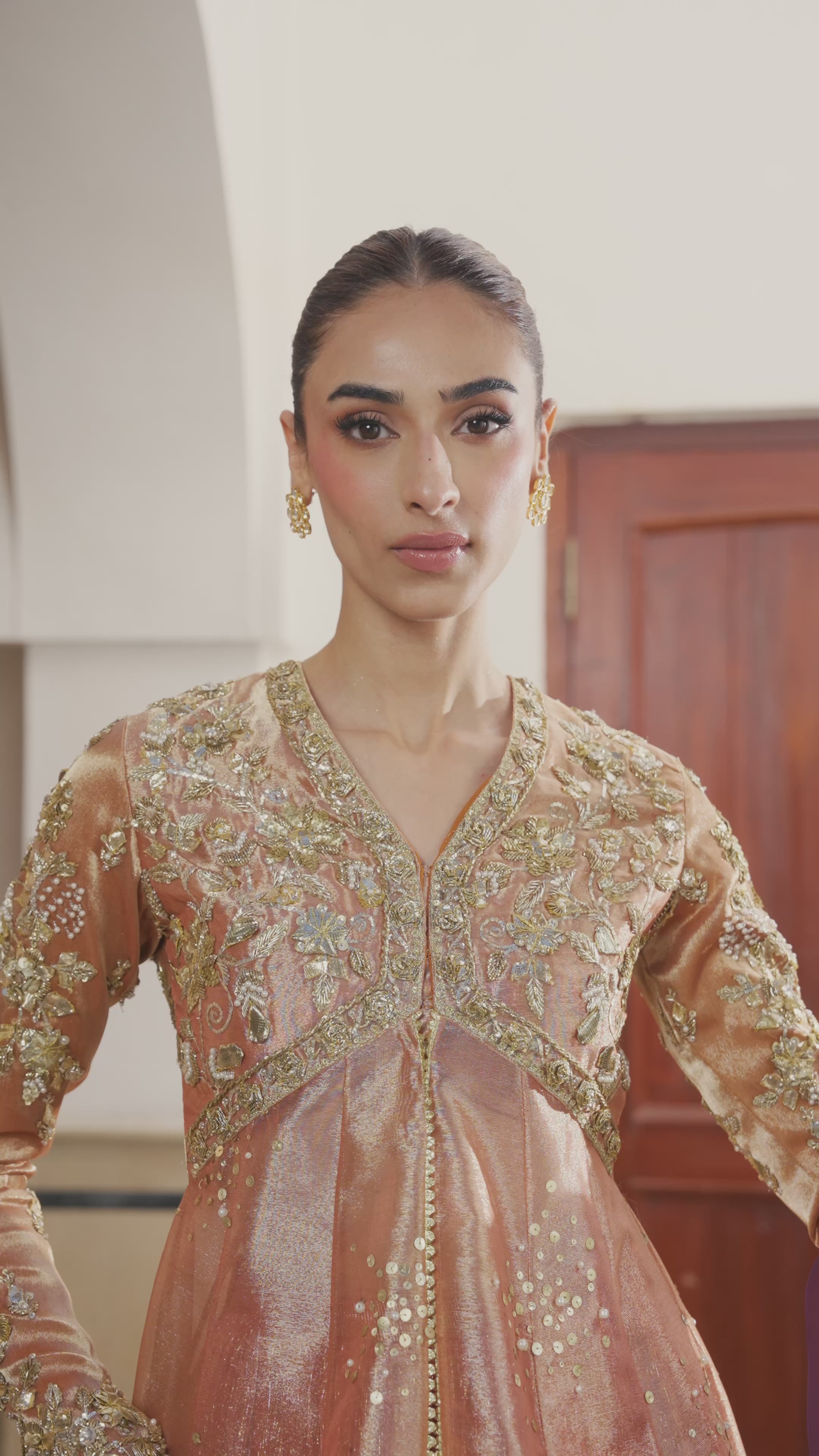 Bano, the shimmery tissue front-open angrakha is adorned with beautiful hand-work in golds and silver. It is paired with our inhouse shimmer swirly lehnga and a contrasting deep purple dupatta, handworked in golds and silver.