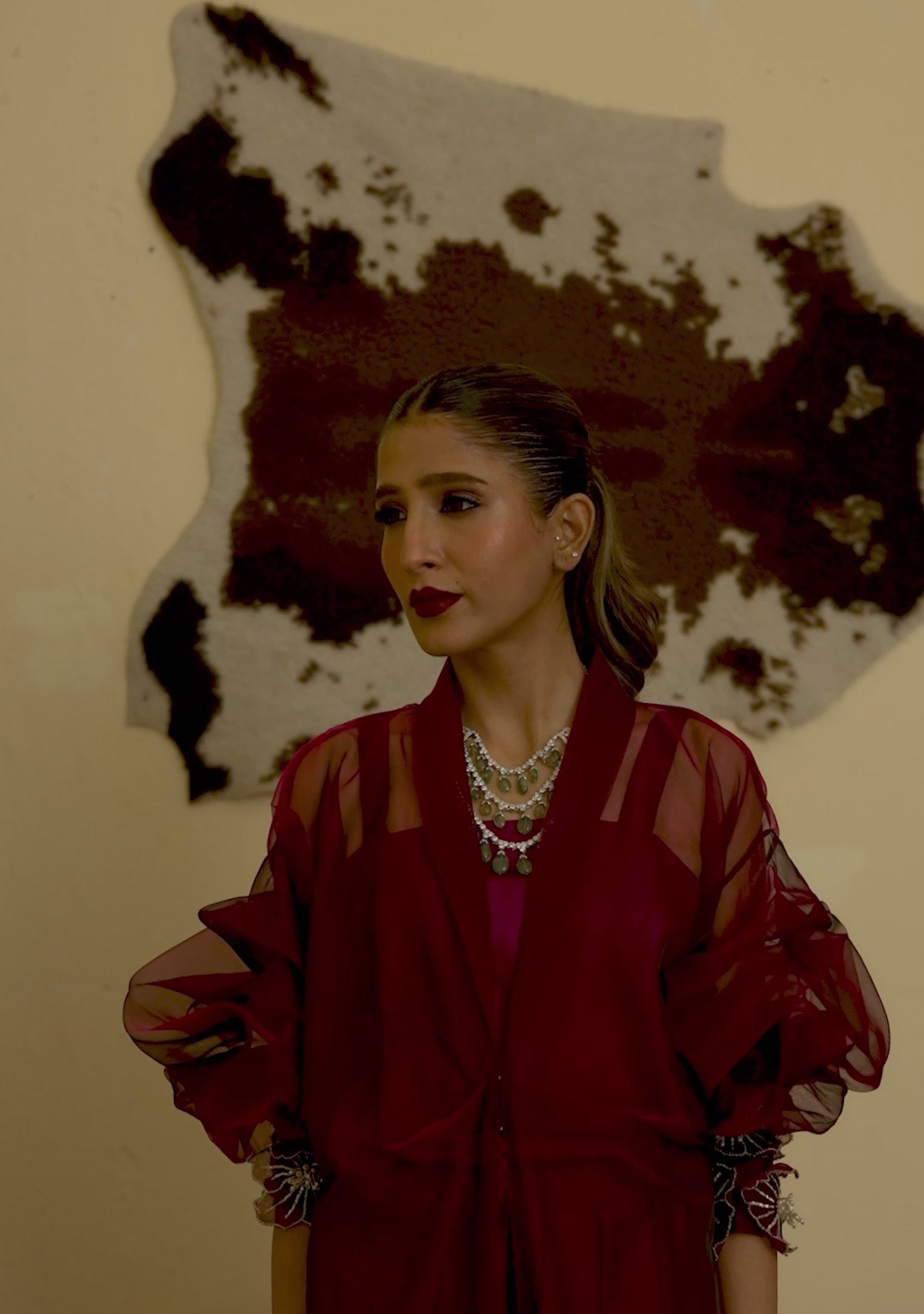 Cala, the magenta organza jacket features statement balloon sleeves with handworked naqshi flower motifs on the cuffs and our new must-have satin silk pleat pants. The set comes with a satin silk slip.