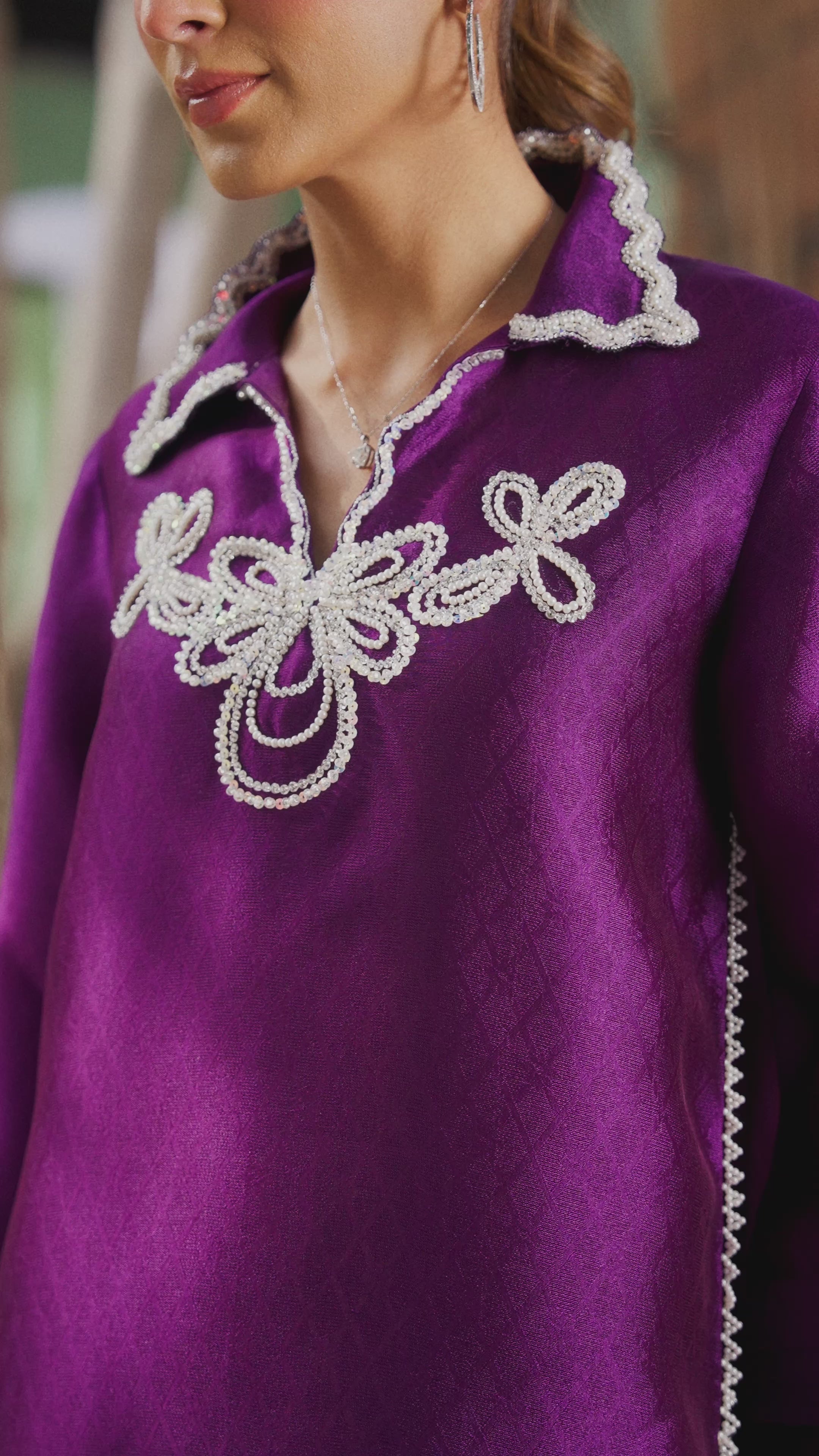 Emani, the deep purple pure self seesha silk kurta comes with a cool collar and baggy sleeves with pearl, crystal and sequin deatiling on the neck. It is paired with a pure sheesha silk shalwar and pleated organza dupatta.