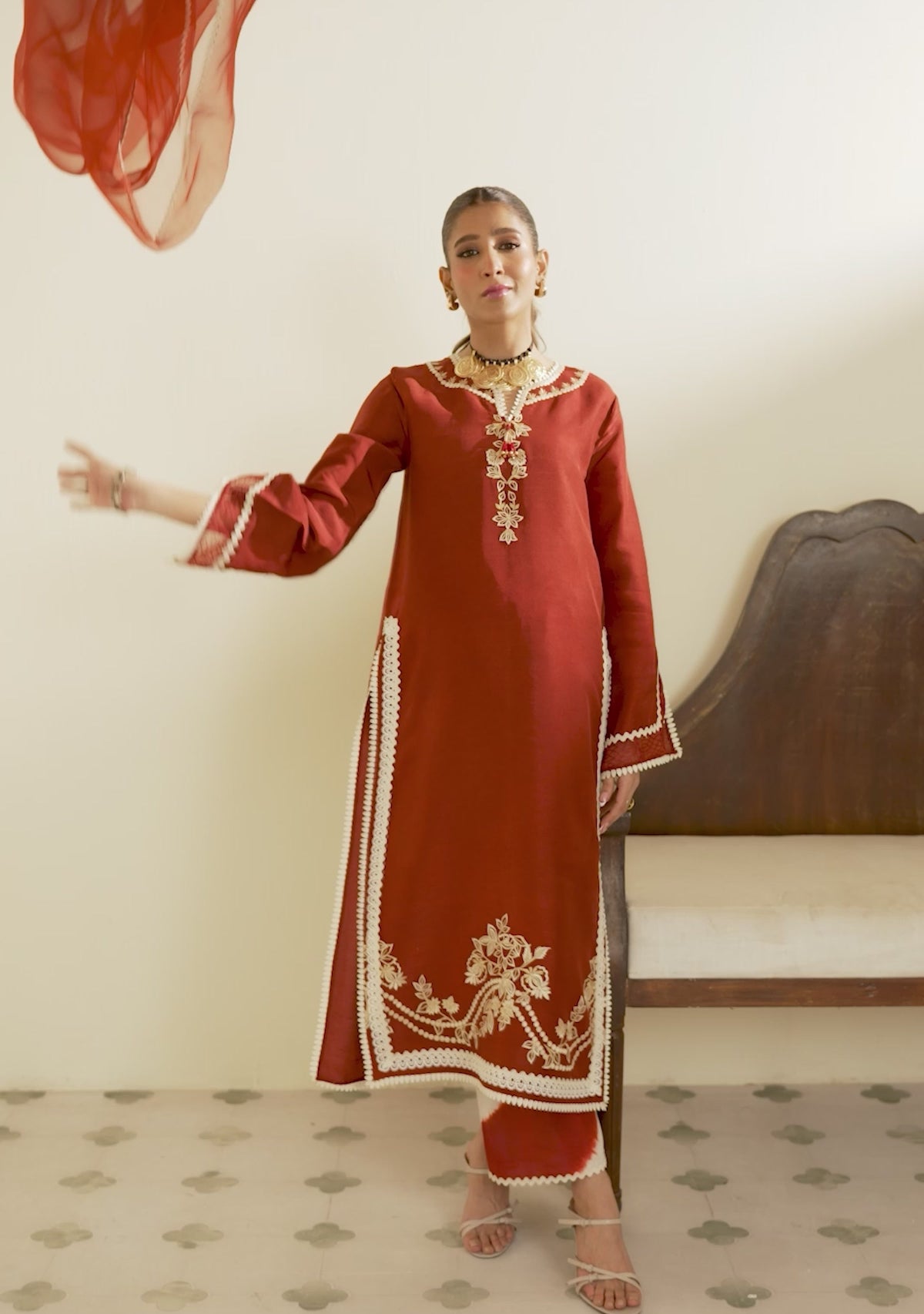 Kainaz, the brick red pure bamber raw silk kurta comes with contrasting embroidery and detailing. It is paired with a two-tone shaded izaar and a brick red pure organza dupatta.