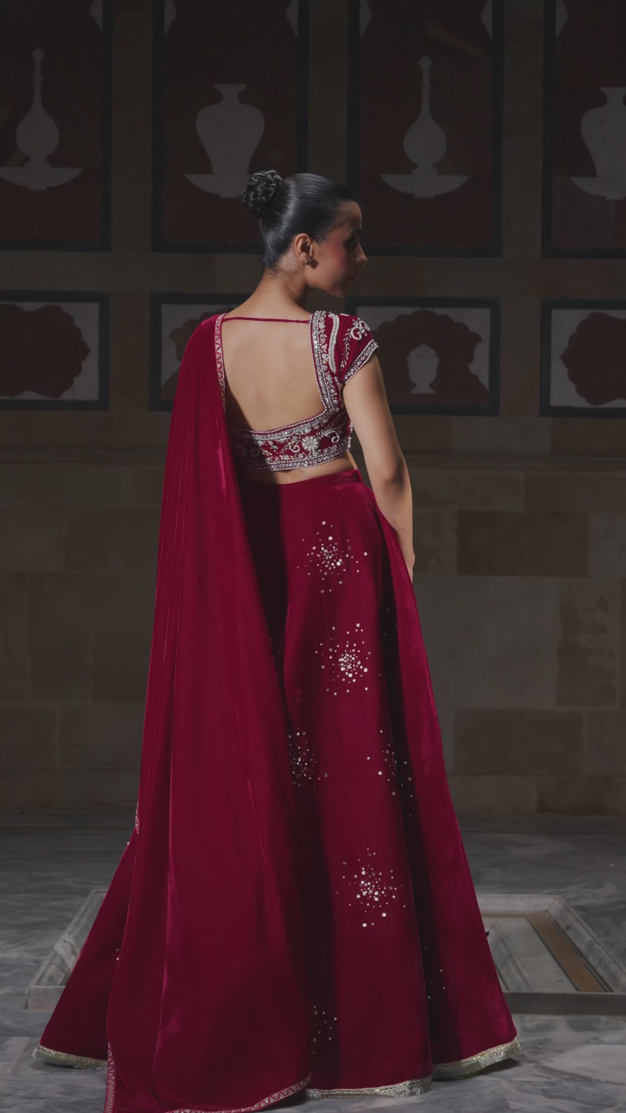 Mahnaz, the deep magenta velvet lehnga choli is meticulously hand-worked in shades of silver and gold. It is paired with a coordinating velvet stole with pink accents.