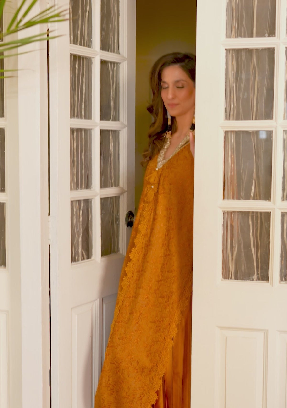 Malisa, the ochre kaftan-cut shirt comes fully embroidered on viscose silk with scalloped edgings. It comes with a hand-embellished wave neckline and is paired with coordinating satin silk pleated pants.