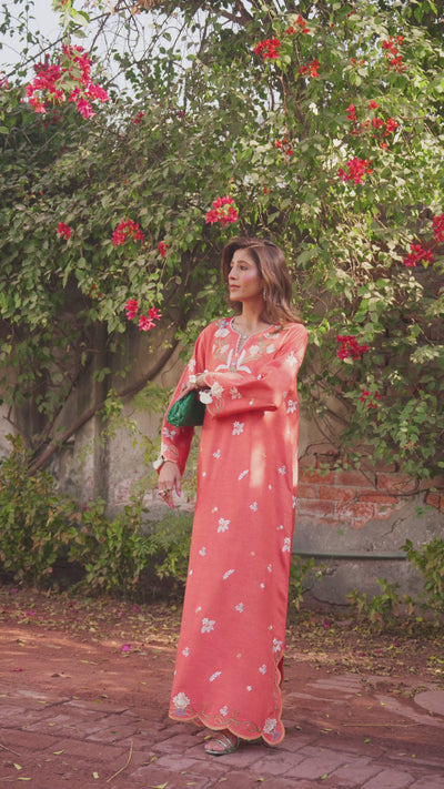 Mersana, the rust pure bamber raw silk kaftaan comes with contrasting colorful embroideries all over, accentuated with contrasting tassels on sleeves.