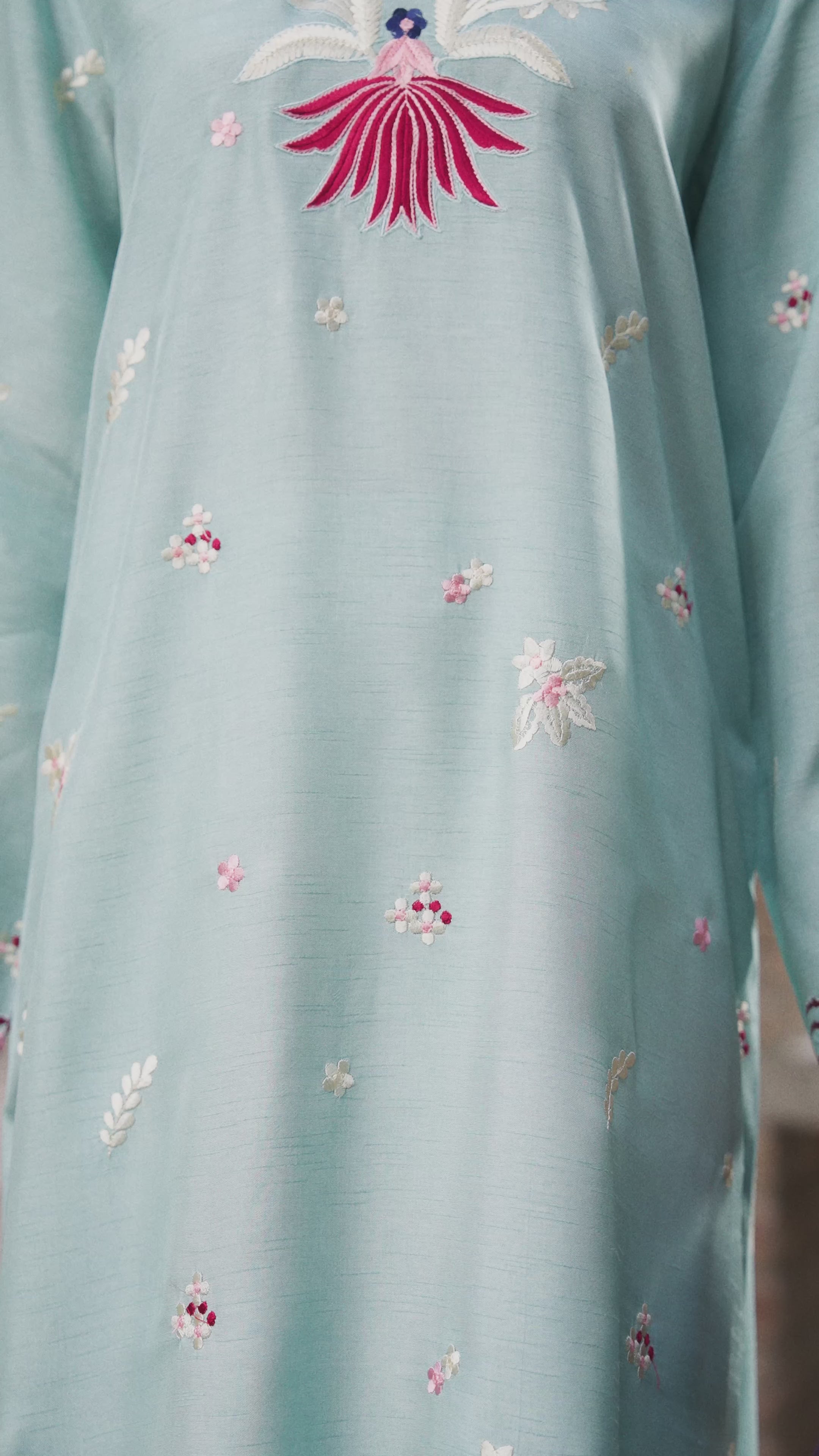 Mersana, the sky blue pure bamber raw silk kaftaan comes with contrasting colorful embroideries all over, accentuated with contrasting tassels on sleeves.
