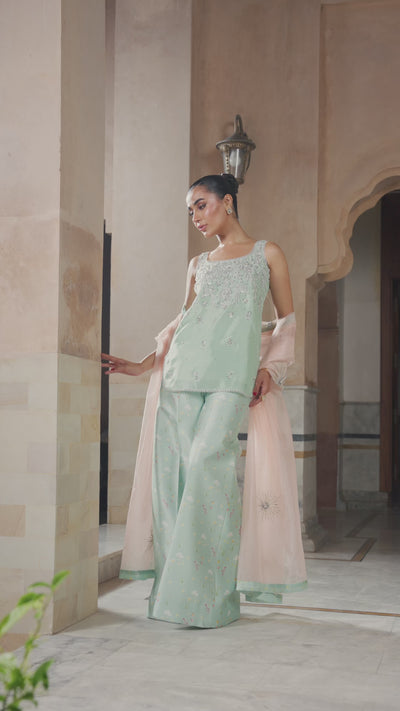 Yara, the mint short shirt comes in tassel silk with unique silver hand-work paired with our inhouse mint printed pants and a contrasting pale pink dupatta with hand-worked star burst spray.