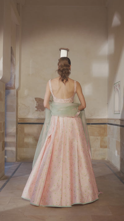 Yasna, the peachy pink lehnga choli comes with a sequined cutwork blouse paired with our inhouse print lehnga pleated to perfect. The dreamy silhouette is completed with a contrasting mint organza dupatta with hand-worked star bursts.