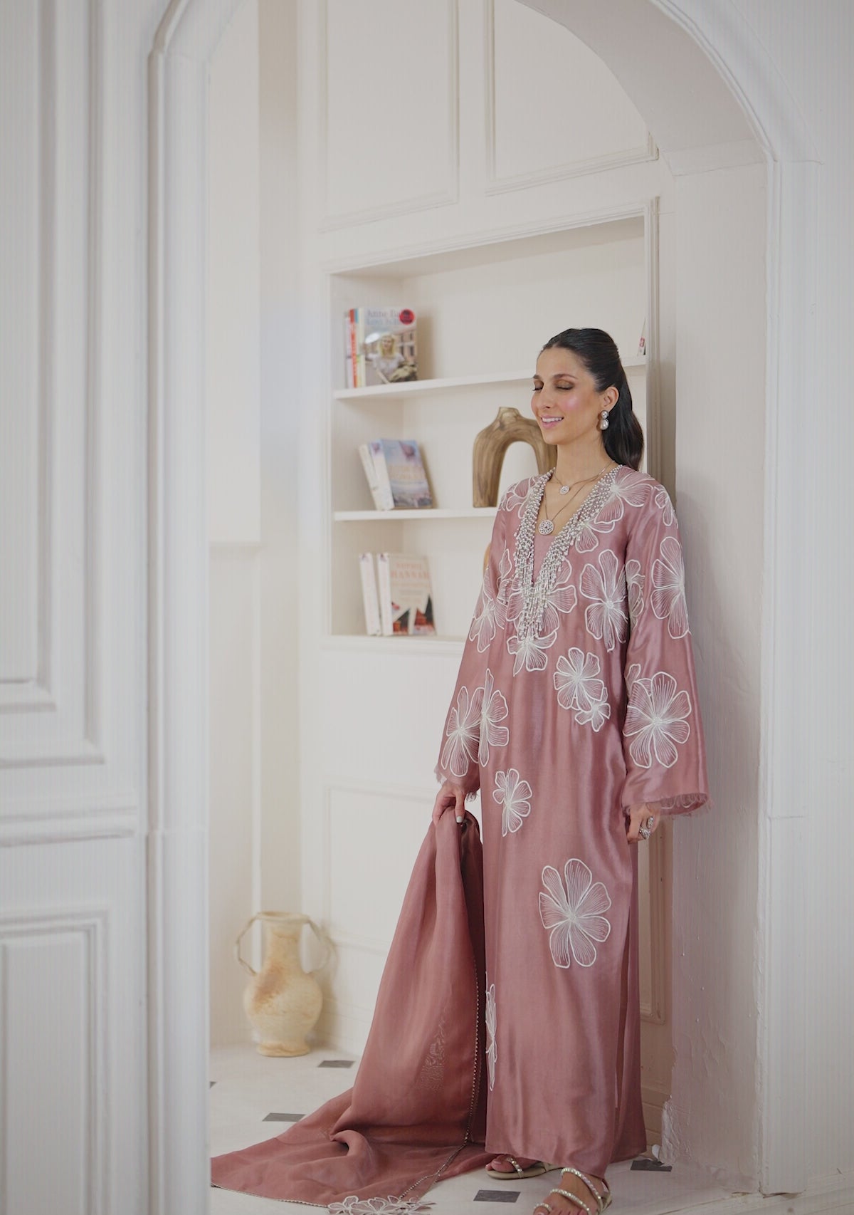 Ziana, the mauvy pink boxy kurta comes with asymmetrical floral bunches and a tasseled neckline on pure butter silk. It comes with matching cigarette pants and a medium silk dupatta.