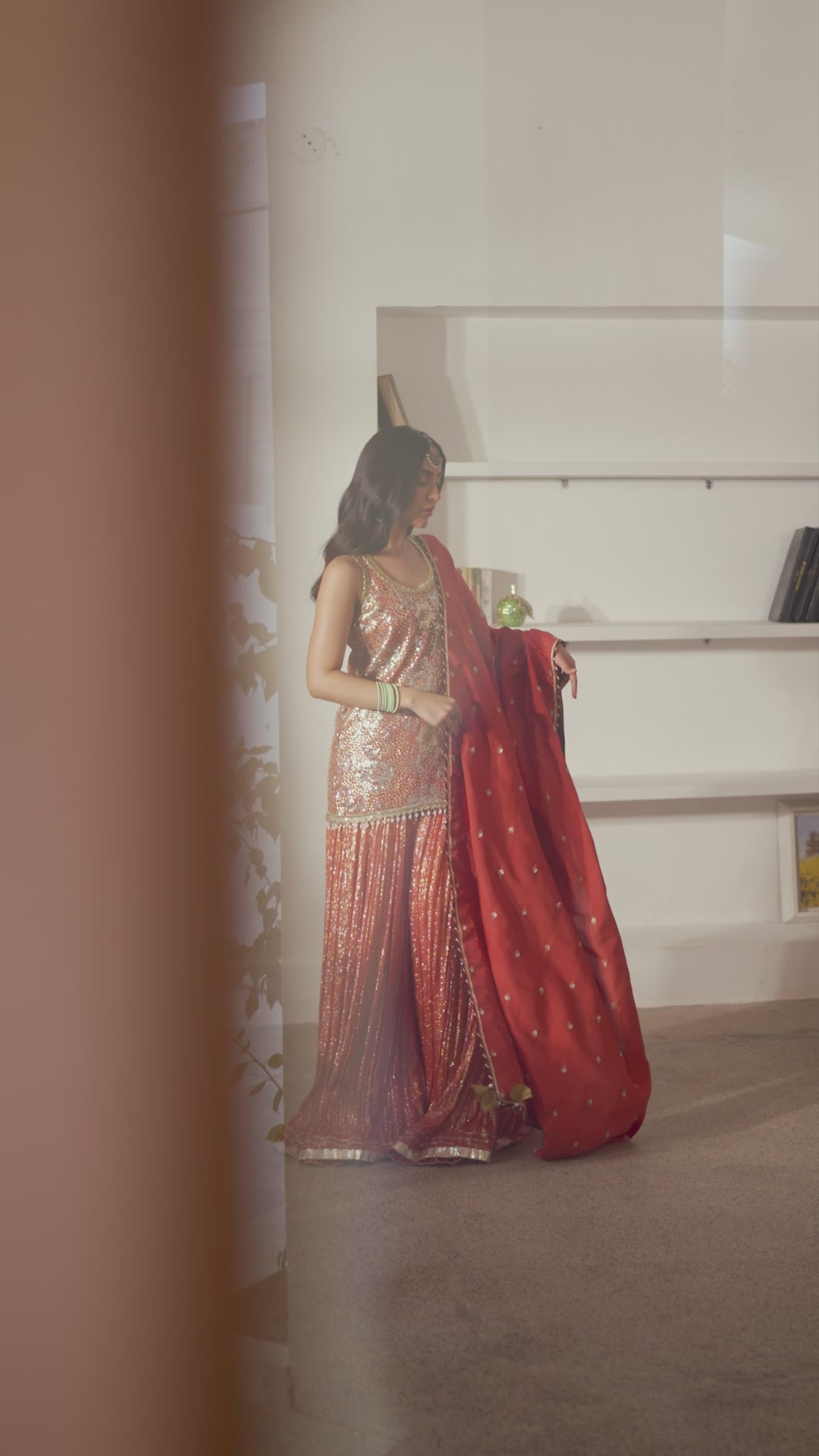 Zora, the rust shift shirt embellished with gold and silver sequins comes with gold edgings and a glimmery crushed chiffon sharara. The set is paired with a silk boti dupatta with lime and black finishings.